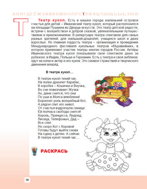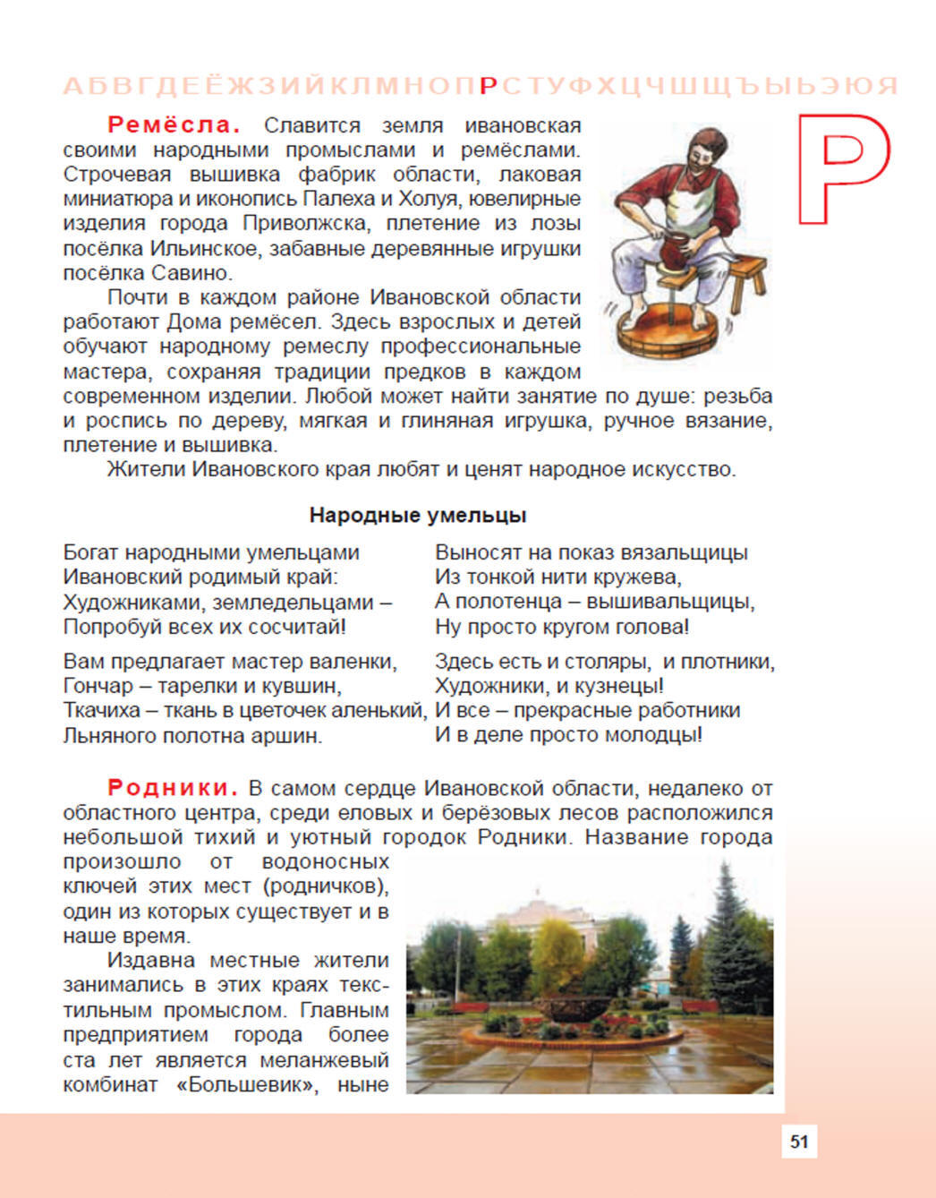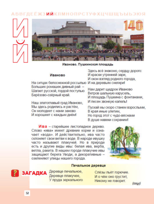 Юним жителям обласного російського міста Іваново (до 1932 Іваново-Вознесенськ) дуже пощастило: для них чудовий творчий колектив, що складається з Світлани Леонідівни Сон (автор віршів), Олени Вікторівни Чинаевой (автор пояснювального тексту), Олександри Михайлівни Чистих (художник-ілюстратор), з великою любов'ю написав цікаво-пізнавальну краєзнавчу азбуку: на кожну літеру алфавіту в ній що-небудь яскраве і цікаве про їх рідне місто і область. В ній крім чудових віршів, загадок і статей є ще й кросворди, филворды, розмальовки, прописи, словникова ігротека. Ось за такої Азбуки юні іванівці з самих ранніх років будуть вчитися любити і пізнавати свою малу батьківщину. Серія подібних книжок у московському видавництві "Планета" так і називається: "Моя мала батьківщина". Далеко не всі міста Росії можуть похвалитися Азбукою свого міста, написаної спеціально для його маленьких мешканців! Ця Абетка буде цікава і всім-всім маленьким росіянам! Адже вона познайомить їх не тільки з буквами російського алфавіту, але і з чудовим текстильним краєм, часткою їх великий спільної Батьківщини - Росії. Для знайомства з Азбукою юного ивановца на сайті викладено кілька сторінок цього чудового видання. А всього в книзі 80 кольорових сторінок формату А-4. І скільки на них чудових краєзнавчих матеріалів!